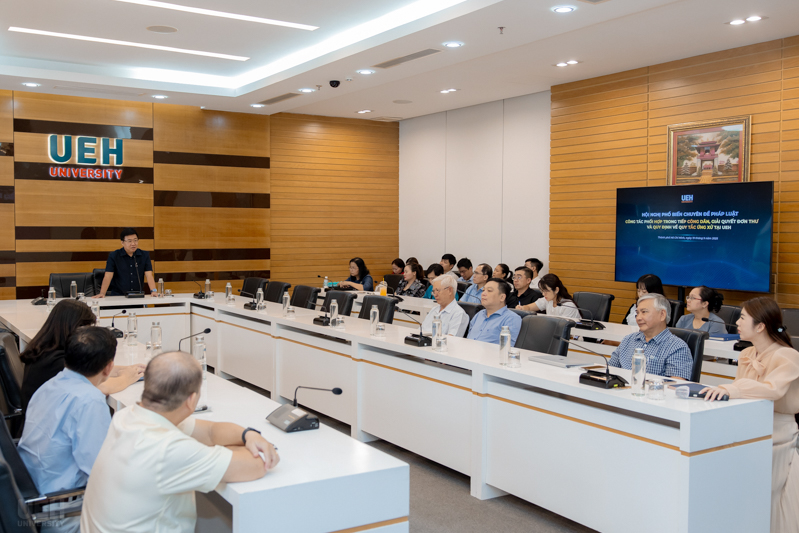 Tiếp nối thành công của chuỗi Hội nghị phổ biến chuyên đề pháp luật tháng 9/2025, sáng ngày 19/9/2025, tại Phòng A.205 (Cơ sở 59C Nguyễn Đình Chiểu, Phường Xuân Hòa, TP. Hồ Chí Minh) và trên nền tảng trực tuyến, Đại học Kinh tế Thành phố Hồ Chí Minh (UEH) đã tổ chức Hội nghị phổ biến chuyên đề pháp luật “Công tác phối hợp trong tiếp công dân, giải quyết đơn thư và quy định về quy tắc ứng xử tại UEH”.